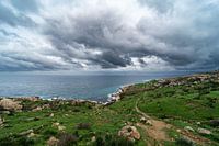 View over the rocks, valleys and local agriculture at the bay of the Mediterranean sea, Selmun, Malta