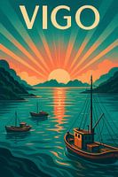 Deze Art Deco poster van Vigo toont de schoonheid van de grootste stad van Galicië bij zonsondergang, met vissersboten die zachtjes dobberen op glinsterend water onder stralende gouden lichtbundels. De poster is ontworpen in de stijl van een vintage reisposter en combineert levendige art-decokleuren, zoals roodgroen, oranje bij zonsondergang en diepblauw, met een gevoel van kalme maritieme elegantie. Vigo staat bekend om zijn bruisende haven, prachtige kustlijn en de toegangspoort tot de Cíes-eilanden, die deel uitmaken van het Nationaal Park Atlantische Eilanden. Dit kunstwerk weerspiegelt zowel de werkgeest van de zeevarende tradities als de natuurlijke schoonheid van de kustlandschappen. Perfect voor iedereen die houdt van Spaanse kuststeden, nautische thema's of de esthetiek van vintage reizen, voegt deze Vigo poster warmte en stijl toe aan elke kamer. Of hij nu in een woonkamer, kantoor of vakantiehuis hangt, hij brengt de sfeer van de zonsondergangen en zeegezichten van Galicië in je interieur.