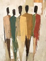 Vijf Figuren - In dit abstract schilderij zie je een serie van vijf mensen, met verschillende huidstinten en kleding in vrolijke kleuren zoals geel, groen en rood, die samen een sterke indruk maken op de lichte achtergrond.