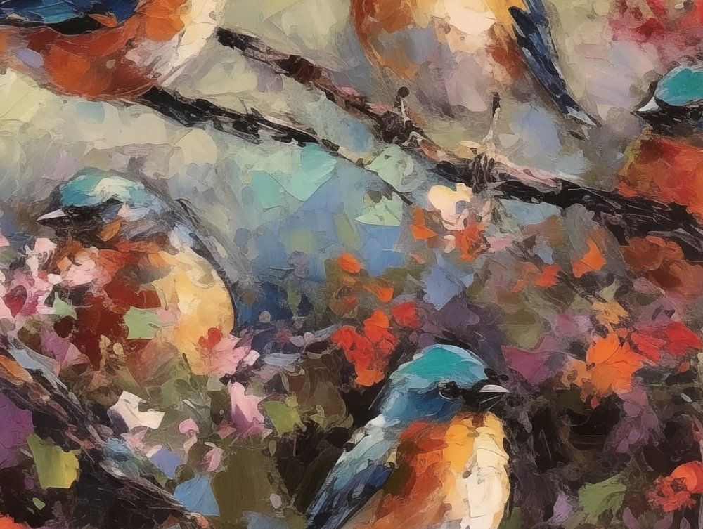 Dit werk toont een groep ijsvogels die rustig op een tak zitten te fluiten. Het is een impressie met vrolijke kleuren en een warme sfeer. Dit werk is een geschikte toevoeging voor iedere warme en kleurrijke ruimte.