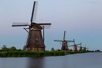 Vijf molens op een rij in Kinderdijk na zonsondergang. De lucht kleurt in mooie pasteltinten blauw, lila en paars.