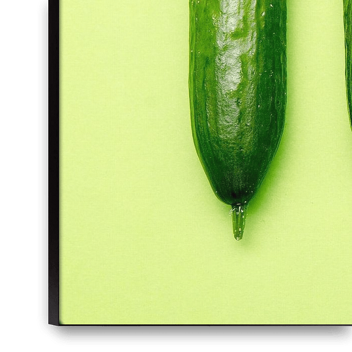 Koop de foto Vijf verse komkommers op een groene achtergrond van Alexander Baumann als print op canvas, aluminium dibond, (ingelijste) fotoprint, behang en ArtFrame. Voor jou op maat geprint in Fine-Art kwaliteit.