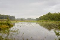 De grote vijver van natuurreservaat De Teut in Zonhoven, België op een druilerige, bewolkte zomerdag.