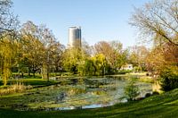 Vijver in het stadspark met wolkenkrabber in Essen Ruhrgebied