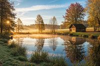 Een sereen landschap met een vijver waarin bomen en een kleine hut weerspiegeld worden onder een blauwe hemel met lichte wolken. Ochtendmist hangt over het water.