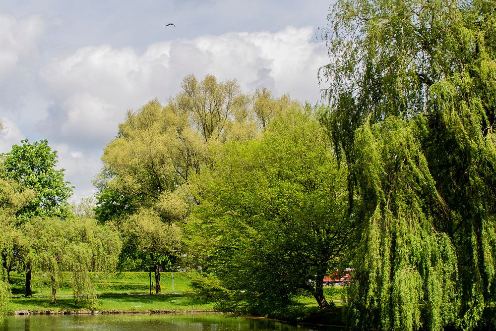 Een prachtig vijver met hele mooie begroeiing, hartje zomer. Op de achtergrond een mooie wolkenlucht.