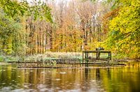 Vijver met roestige installaties in het Waterloopbos bij Marknesse in de Noordoostpolder op een regenachtige en toch kleurrijke herfstdag.