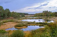 De hoofdvijvers van natuurgebied De Teut in Zonhoven, België. De bewolkte lucht wordt gereflecteerd in het water van de vijvers.