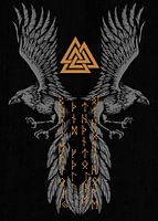 De afbeelding toont twee majestueuze raven met uitgestrekte vleugels, die in de Noorse mythologie Odins metgezellen Hugin en Munin symboliseren. Tussen hen in staat het gouden Valknut-symbool, dat vaak wordt geassocieerd met Odin en krijger-eer. De veren zijn gegraveerd met runen in gouden letters, die een diepere mystieke betekenis…