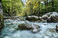Beeld met lange sluitertijd van de Voidomatis-rivier in de Vikoskloof in het noordwesten van Griekenland.