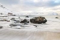 De atmosfeer in de winter op dit strand is bijzonder. Prachtige lange golven in deze blauwgroene baai brengen het water tot aan de rotsen. Met een lange sluitertijd bij eb zie je het water teruggaan.