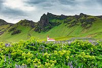 Boven het dorpje Vik, op een heuvel, staat de kerk, omringd door lupines. De Víkurkirkja is gebouwd tussen 1932 en 1934.