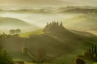 Villa Belvedere in Val d'Orcia. Italië, Toscane. De schilderachtige heuvels met de welbekende Villa Belvedere. Ochtendnevel hangt nog in de vallei en de ochtend komt langzaam op gang en de zon beschijnt voorzichtig de wijnvelden.