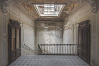 Het trappenhuis of gang in een oud en vervallen pand is meestal niet het gedeelte waar het meeste licht naar binnen valt. In deze prachtige villa was dit wel het geval. Het licht valt mooi naar binnen door een grote lichtkoepel voorzien van kleine raampjes.