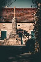 Deze kleurenfoto vangt de serene sfeer van een oud Frans dorpsplein, waar een kruis in het midden staat als stil symbool van geschiedenis en traditie.