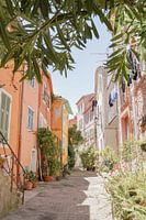 Op deze foto zie je de pastel kleurige straatjes van het dorpje Villefranche Sur Mer met groene olijfblaadjes.
