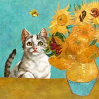Dit vrolijk gekleurde kunstwerk is een collage van afbeeldingen van Vincent van Gogh en met een kat die vol interesse (en met waarschijnlijk geen goede bedoelingen) naar een vlinder kijkt.
