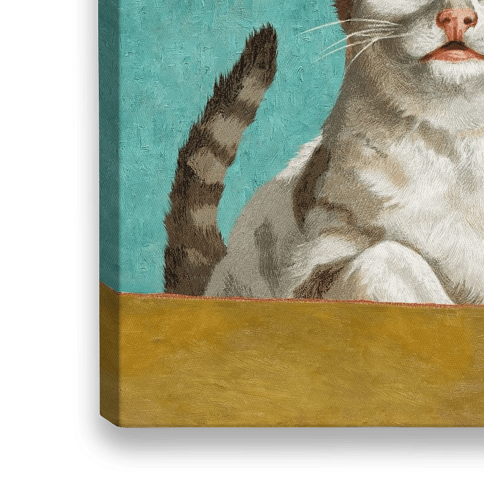 Dit vrolijk gekleurde kunstwerk is een collage van afbeeldingen van Vincent van Gogh en met een kat die zijn pootje heeft uitgestoken heeft om 1 van de zonnebloemen te grijpen. En we weten allemaal... dat loopt waarschijnlijk niet goed af voor de vaas, de bloemen en de tafel.