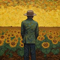 Man in een veld met zonnevloemen, geschilderd in de stijl van Vincent van Gogh