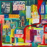 Art brut, outsider art, kleurrijke collage, kindertekeningen, collage van tekeningen, modern kleurrijk schilderij, vrolijk schilderij, speels schilderij, mixed media, Dubuffet, Basquiat, neo expressionisme, cobra kunst.
