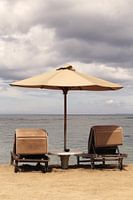 Bali in vintage sfeer. Twee strandstoelen en parasol op het strand. Ligbedden in het zand aan de rand van de zee / oceaan. De foto lijkt op een oude ansichtkaart. Terug in de tijd, vakantiegevoel in Sanur, Bali, Indonesië. Nostalgie.