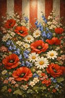 Een levendig, vintage-geïnspireerd botanisch kunstwerk waarin weelderige lentebloemen dramatisch bloeien tegen een achtergrond van opvallende rode en crèmekleurige verticale strepen. Scharlakenrode klaprozen, delicate witte madeliefjes en zachtblauwe klokjesbloemen vormen een rijke weidecompositie die zowel nostalgisch als theatraal…