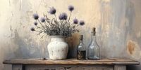 Dit kunstwerk toont een serene stillevenstudie met een verrassende schoonheid in eenvoudige, alledaagse voorwerpen. De blauwpaarse distels contrasteren mooi met de verweerde, aardse tinten en texturen van de vaas en flessen. Het straalt een tijdloze, rustige elegantie uit, met een vleugje melancholie over vergane tijden.