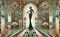 Een klassiek Art Deco vignet waar een verfijnd figuur en gedisciplineerde geometrie elkaar ontmoeten. Gouden accenten, diepgroen en zwart creëren een duidelijk contrast terwijl getrapte randen, waaiermotieven en slanke frames de blik vasthouden. Het silhouet blijft in het midden, met scherpe randen, afgemeten ruimte en een rustige negatieve ruimte die de scène elegant houdt in plaats van druk. Subtiele tonale verschuivingen voegen diepte toe zonder te verblinden, zodat de gloed beheerst en architectonisch overkomt.
