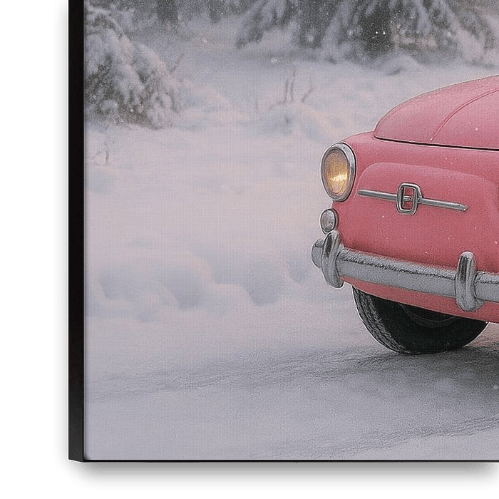 Een charmante roze Fiat 500 rijdt door een besneeuwd landschap, met een versierde kerstboom stevig vastgebonden op het dak. De warme lichtjes en zachte sneeuwvlokken brengen direct een feestelijke en nostalgische sfeer tot leven.