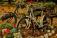 Vintage Fietsplanters – Rode Geraniums in een Rustieke Tuin van Broodrooster Studio – Creatieve Fotografie