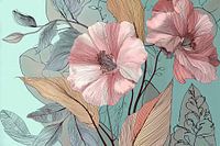 Een botanische illustratie in een harmonieus samenspel van zachte pasteltinten. Grote roze bloemen met subtiele lijntekeningen domineren het beeld tegen een rustgevende mintgroene achtergrond. De compositie combineert realistische bloemvormen met decoratieve elementen in grijze en goudachtige tinten, wat resulteert in een tijdloos en…