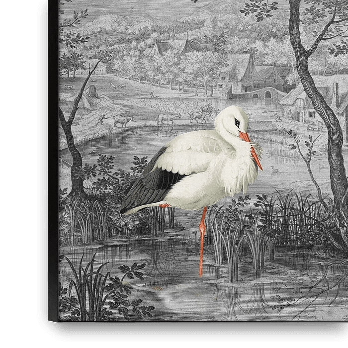 Dit klassieke werk is vervaardigd in grijstinten, op de in het water staande ooievaar na. Dit geeft een uniek en subtiel effect aan dit sfeervolle tafereel.
