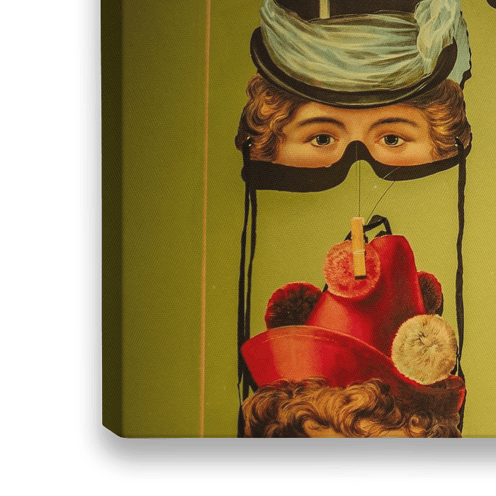 Krullend haar, veren, helmen en hoge hoeden vormen een kleurrijke collage die nostalgie oproept. De zachte spot op de groene achtergrond benadrukt textuur van papier en hout, terwijl de knijpers een ateliergevoel geven. Perfect voor interieurs met retro, boho of creatieve stijl.