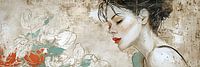 Vintage Portret - Dit uitgerekt portret toont een stilistische vrouw in profiel tegen een achtergrond met geschilderde florale vormen. Met een vintage gevoel door het gebruik van sepia- en aardetinten, springen de rode lippen en fris blauwgroen eruit, wat zorgt voor een subtiele maar krachtige color pop.