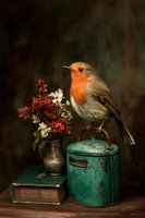 Breng warmte, elegantie en een vleugje nostalgie in je interieur met dit prachtige kunstwerk. Het schilderij toont een roodborstje dat sierlijk balanceert op een verweerde turquoise blik, omringd door een klein stilleven van droogbloemen en vintage boeken. De rijke kleuren, subtiele lichtval en verfijnde details geven het geheel een…