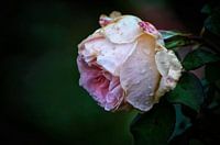 Het zijn juist de vervagende kleuren die deze prachtige roos een delicate en zachte uitstraling geven. Het delicate roze van de binnenste bloemblaadjes schemert door de buitenste bleke blaadjes. De golvende bloemblaadjes met waterdruppels maken hem ook romantisch en nostalgisch.