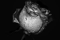 Een rozenportret in zwart-wit. Het zwart-witte contrast laat de waterparels glinsteren en bijna schitteren. Je ziet de contouren van de bloemblaadjes en de mooie vorm die het resultaat is van de golvende bloemblaadjes. Door het vallende licht lijkt de roos uit de duisternis te voorschijn te komen. Een elegante verschijning die een natuurlijke schoonheid laat zien met filigraan details. Mooi om naar te kijken.