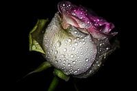 Waterparels glinsteren over deze prachtige roos en laten haar elegant glanzen. De vervagende kleuren zorgen voor prachtige tinten en kleurverlopen van crèmewit naar groen/geel tot de paars/roze uiteinden. Een portret dat opvalt door zijn schoonheid en elegantie.