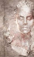 Portret van een serene vrouw in oud roze tinten op een grof geweven linnen doek met vintage bloemenpatroon.