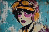 Vintage Vibes Audio - Dit vrouwen schilderij toont een jonge vrouw met een pilotenpet en grote, stijlvolle hoofdtelefoons, uitgebeeld in een levendige, abstracte pop-art stijl met dynamische, grof aangebrachte verfstreken en een kleurrijk palet.