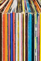 Collectie van vintage gebruikte vinyl 12" lp platen albums. Muziekdecor voor de nostalgische audiofiel, liefhebber van rock, pop, disco of jazz, dat tevens een abstract kleurrijk streepjespatroon oplevert. Stilleven fotografie