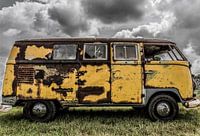 Een gele Volkswagen Transporter, heel roestig, op een oldtimer evenement in Nederland.