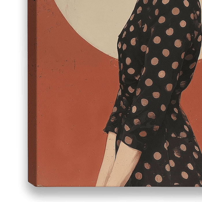 Een portret van een vrouw in profielzicht, gekleed in een elegant zwart jurkje met roze stippen, afgewend in gedachten onder een opvallende bordeauxrode hoed. De compositie speelt met warme, nostalgische tinten en minimalistische vormen, waarbij een groot zachtgeel cirkelvormig element als serene achtergrond fungeert. Dit stijlvolle…
