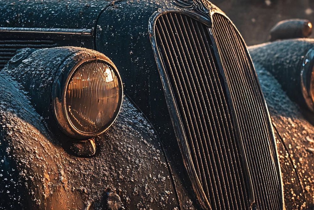 Deze prachtige close-up van een vintage auto geeft de klassieke charme van vervlogen tijden weer. Met een stoffige laag die het authentieke karakter van de auto benadrukt, roept dit beeld een nostalgisch gevoel op van verlaten garages en vergeten voertuigen. Het warme licht dat door de ramen naar binnen valt, voegt een zachte, sfeervolle gloed toe aan de scène, wat de details van de koplampen en het grillwerk nog meer laat spreken. Een perfecte keuze voor liefhebbers van klassieke auto's en degenen die houden van een robuuste, industriële stijl in hun interieurdecoratie.