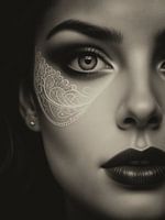 A.I. portret van een vrouw met een taoeage van wit kant op haar gezicht. Vintage film uitstraling door het gebruik van kleur en ruis.