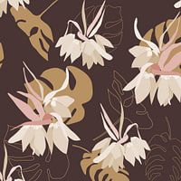 Tropische bloemen en bladeren botanische print in trendy retro kleurenpalet, een combinatie van pastel en neonkleuren.
