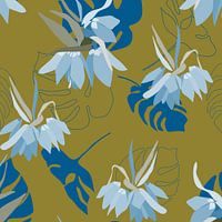 Tropische bloemen en bladeren botanische print in trendy retro kleurenpalet, een combinatie van pastel en neonkleuren.