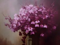 Een digitaal kunstwerk van sierlijke bloemen met een achtergrond in geschilderde kleuren. Voor een botanische en vintage sfeer in je interieur.