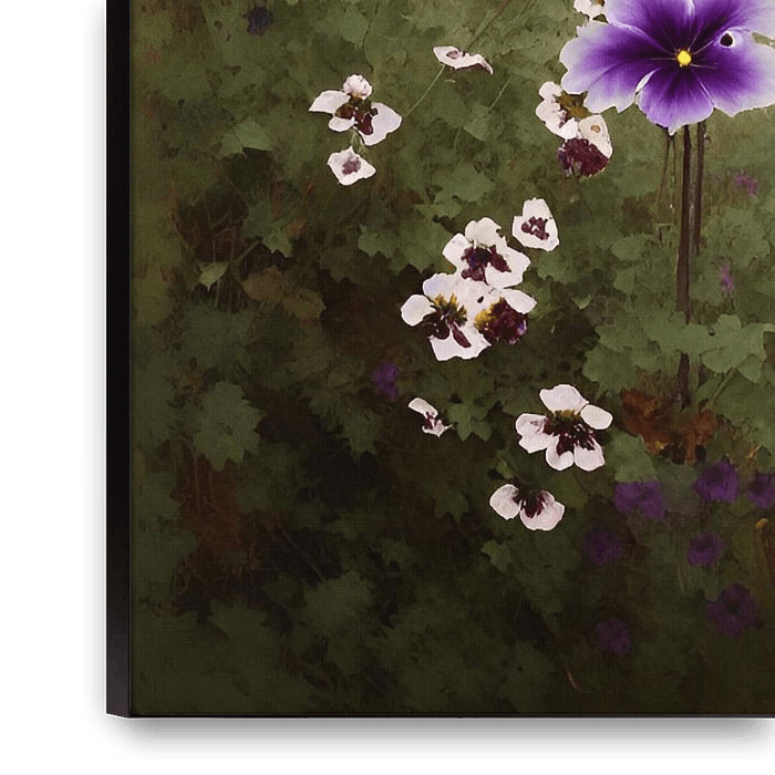 Een digitaal kunstwerk van sierlijke bloemen met een achtergrond in geschilderde kleuren. Voor een botanische en vintage sfeer in je interieur.