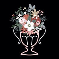 Een elegant vintage bloemenboeket in een vaas op een zwarte achtergrond. Elegant, modern en ideaal om in de meeste interieurstijlen te passen.